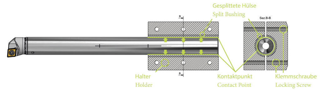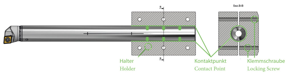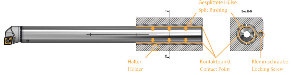 Das Spannen in Standard Bohrstangenhaltern ist nicht geeignet für schwingungsgedämpfte Bohrstangen. Zum einen haben die so gut wie nie die erforderliche Spannlänge noch haben Sie die richtige Klemmung.