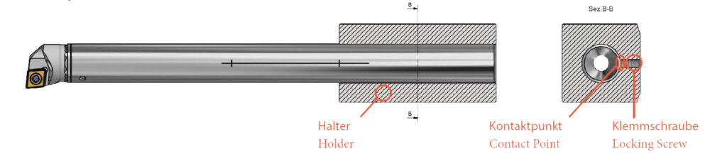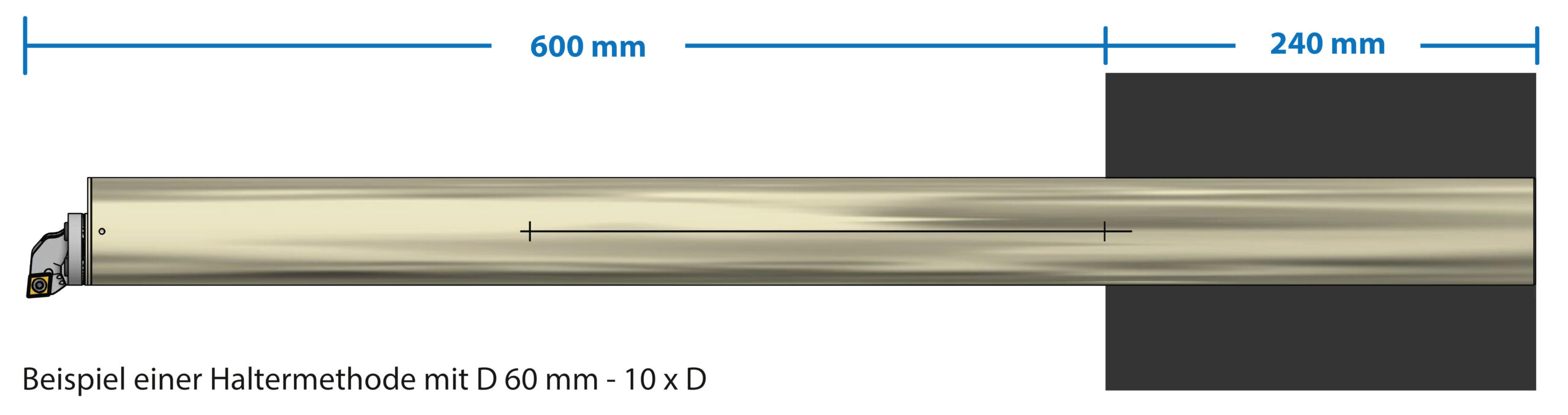 Wenn die Bohrstange über die angegebene Überhanglänge ausgespannt wird ist das Arbeiten deas Dämpfers nicht mehr in vollem Umfang gewährleistet. Des Weiteren führt eine zu kurze Spannlänge zu dem gleichen Ergebnis. Es ist wichtig für die Funktion der Bohrstange die vorgegebenen Parameter ein zu halten.