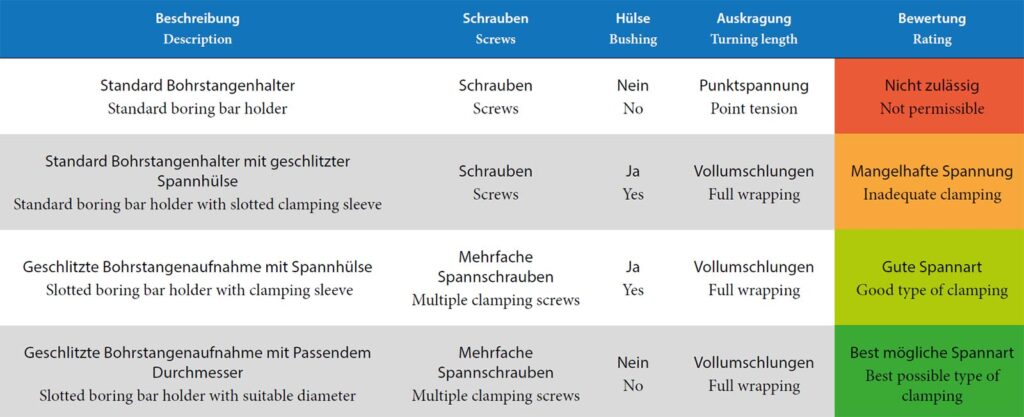 Standard Bohrstangenhalter mit geschlitzter Hülse sind eine Spannmöglichkeit, die funktionieren kann aber nicht muss. Zumeist ist hier dieselbe Thematik das die Spannlänge die erforderlich ist nicht gewährleistet werden kann.