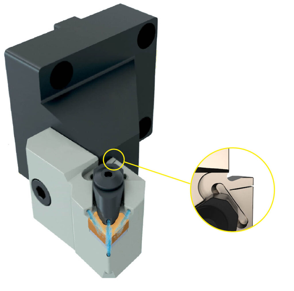 Fixiert bzw. befestigt wird die Kassette über eine M8 Schraube in H12.9 Qualität. Um die Steifigkeit und Stabilität der Kassetten bzw der Kassettenschnittstelle noch weiter zu steigern arbeiten wir mit dualen Anlageflächen. Das bedeutet die Kassette lehnt sich nicht nur über die Seite an den Halter, sondern stützt sich zusätzlich noch über die Schulter am Halter ab. Damit dies überhaupt funktionieren kann gibt es den Wallcut. Hier kann sich das Material der Kassette kontrolliert deformieren, so dass es zu einer exakten Positionierung und kompletten Anlage der Kassette an den Halter kommt sobald die M8 Schraube angezogen wird und die Kugeln die Kassette positionieren. Ohne den „Cut“ im Material wäre dies nicht möglich.